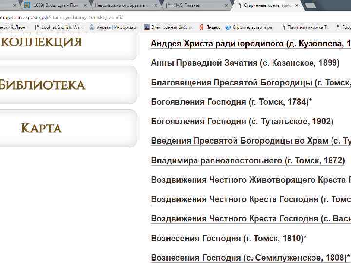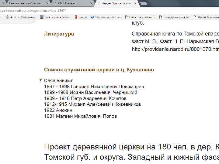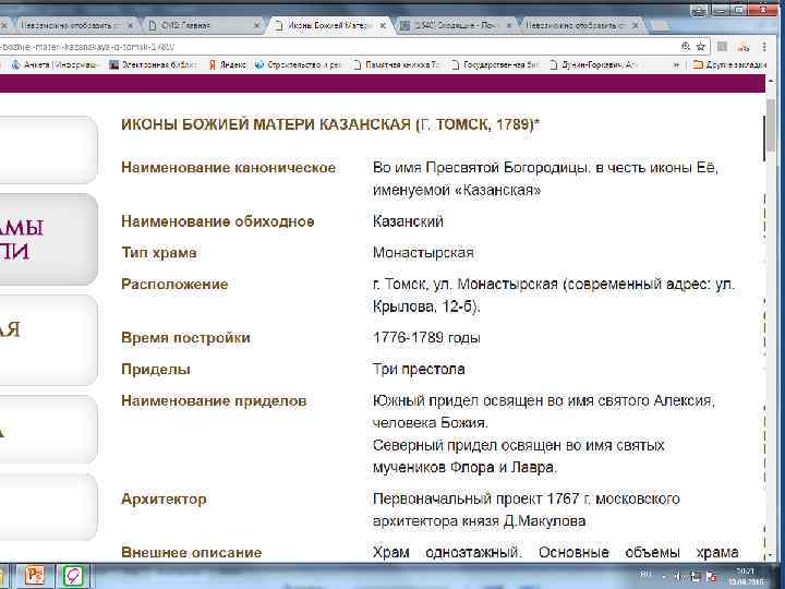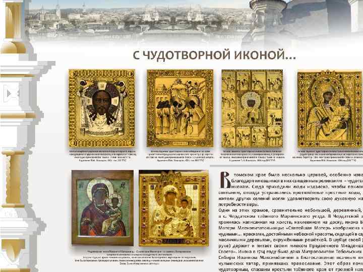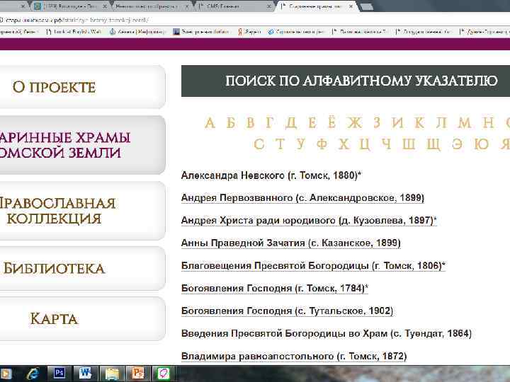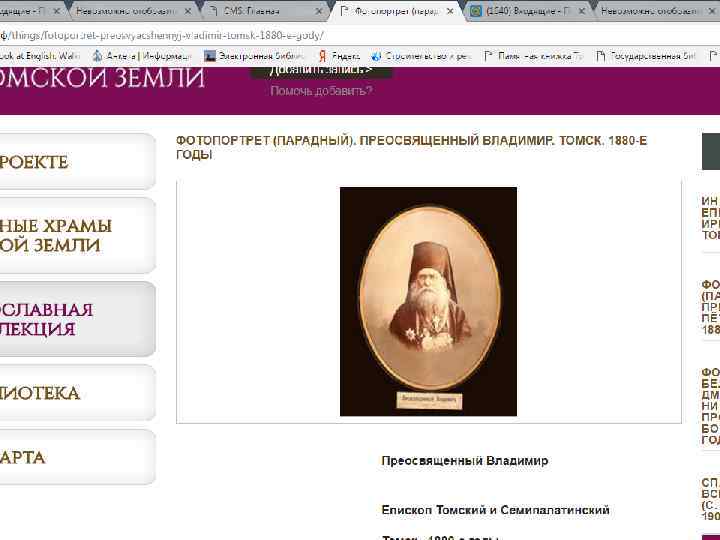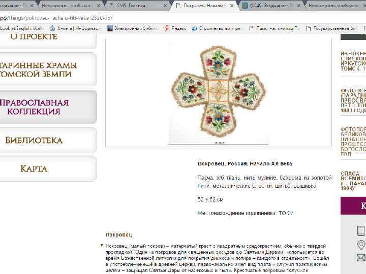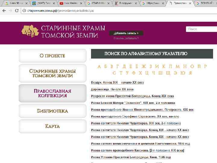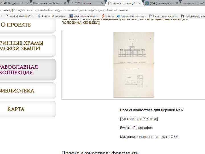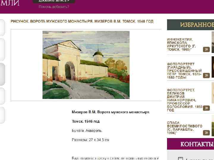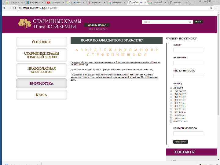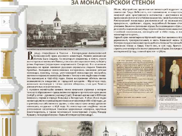 Проект «Старинные храмы томской земли (передвижная выставка с виртуальным компонентом)» Проект направлен на популяризацию истории православия – одного из инструментов духовного воспитания, на передачу молодым поколениям устоявшихся во времени культурных ценностей, культурных национальных кодов. Целевая группа: массовая аудитория, более всего – детско-юношеская. Организация: Томский областной краеведческий музей им. М. Б. Шатилова Руководитель проекта: Андреева Елена Анатольевна; эл. почта: nurrikissam@list. ru; сайт: старинныехрамы. рф