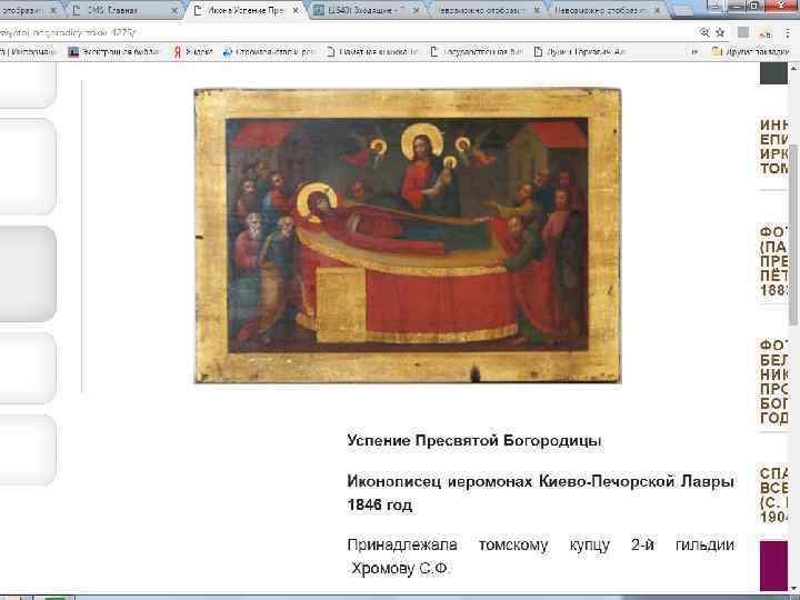 В с. Чердатском таёжного Мариинского уезда. В Чердатской церкви хранилась написанная на холсте, наклеенном на доску, икона Божьей Матери Млекопитательницы. Другие чудотворные иконы, известные своими знамениями и чудесами, находились в храмах, стоявших ближе к Томску: в с. Семилужном – икона святителя Николая Чудотворца, в с. Богородском (ныне д. Старая Шегарка) – икона Божией Матери Одигитрии, в с. Спасском – Нерукотворный образ Христа Спасителя, в с. Ярском икона Введения во храм Пресвятой Богородицы. Эти иконы почитались с XVIII века, когда они были написаны или чудесным образом явлены.