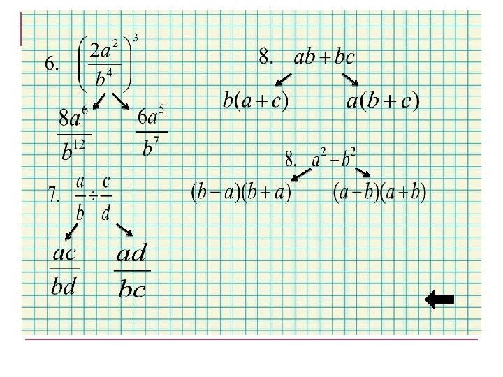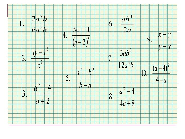 1. При каком условии дробное выражение не имеет смысла? 2. Формула сокращенного умножения 3. Основное свойство дроби 4. Формула сложения и вычитания дробей с одинаковыми знаменателями 5. Формула умножения дробей 6. Формула возведения дроби в степень 7. Формула деления дробей 8. Способ разложения на множители