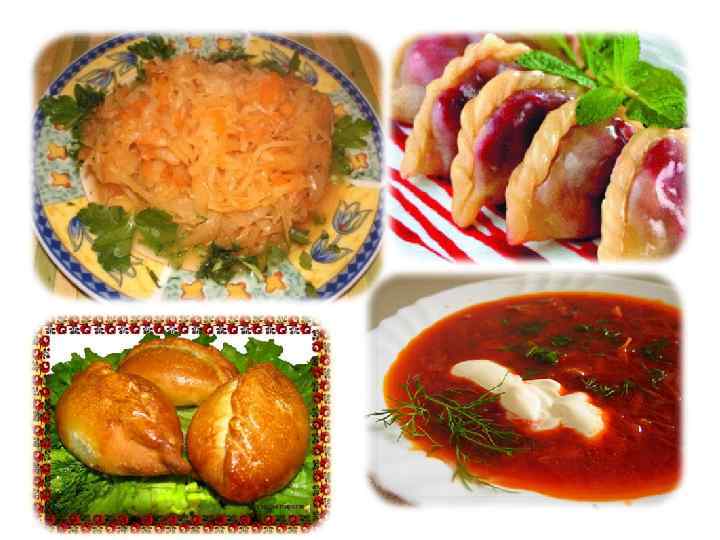 • Особое место кухня Украины отводит блюдам из овощей. Традиционными считаются - тушенная капуста, сиченики, салаты из свёклы, капусты, морковки, зразы, драники. Также славится кухня Украины блюдами из каш. В приготовлении, в основном, используется гречневая, ячневая, пшеничная, манная крупа. • А изделия из муки, которыми богата кухня Украины, - пампушки, гречанки, вареники и галушки, просто поражает воображение.