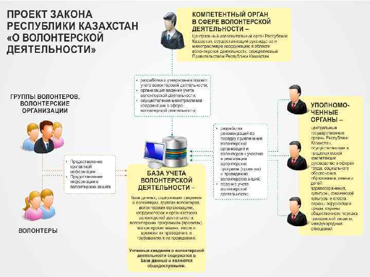 Проект Закона Республики Казахстан О волонтерской деятельности Учет волонтерской деятельности Уполномоченный орган в сфере социального развития Ведение мониторинга волонтерской деятельности, осуществление межотраслевой координации в сфере волонтерской деятельности Информация о волонтере* Волонтер Информация о волонтере БАЗА УЧЕТА Группа волонтеров Информация о том, где и в каких сферах требуются волонтеры Уполномоченны е органы в различных сферах Волонтерская организация * Анкета заполняется на добровольной основе и является подтверждением искреннего и бескорыстного желания помочь стране, ее гражданам. Она несет в себе информацию о волонтере, его навыках и умениях и предпочтительных сферах, где он желает оказать помощь. Информация о волонтере и о мероприятиях, где требуются волонтеры Регистрация в качестве волонтера Общественность