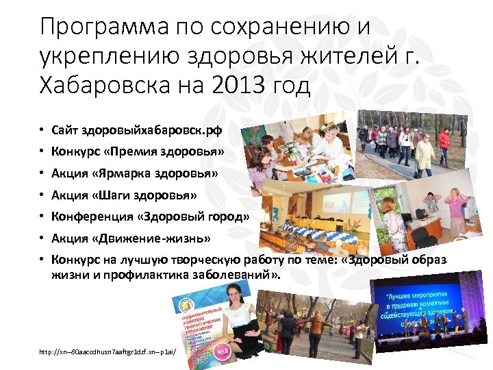 Программа по сохранению и укреплению здоровья жителей г. Хабаровска на 2013 год • Сайт здоровыйхабаровск. рф • Конкурс «Премия здоровья» • Акция «Ярмарка здоровья» • Акция «Шаги здоровья» • Конференция «Здоровый город» • Акция «Движение-жизнь» • Конкурс на лучшую творческую работу по теме: «Здоровый образ жизни и профилактика заболеваний» . http: //xn--80 aaccdhusn 7 aaftgr 1 dzf. xn--p 1 ai/