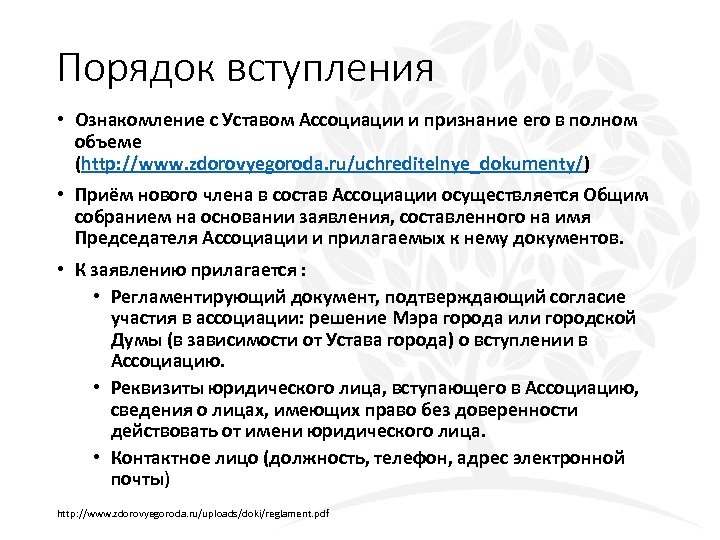 Порядок вступления • Ознакомление с Уставом Ассоциации и признание его в полном объеме (http: //www. zdorovyegoroda. ru/uchreditelnye_dokumenty/) • Приём нового члена в состав Ассоциации осуществляется Общим собранием на основании заявления, составленного на имя Председателя Ассоциации и прилагаемых к нему документов. • К заявлению прилагается : • Регламентирующий документ, подтверждающий согласие участия в ассоциации: решение Мэра города или городской Думы (в зависимости от Устава города) о вступлении в Ассоциацию. • Реквизиты юридического лица, вступающего в Ассоциацию, сведения о лицах, имеющих право без доверенности действовать от имени юридического лица. • Контактное лицо (должность, телефон, адрес электронной почты) http: //www. zdorovyegoroda. ru/uploads/doki/reglament. pdf