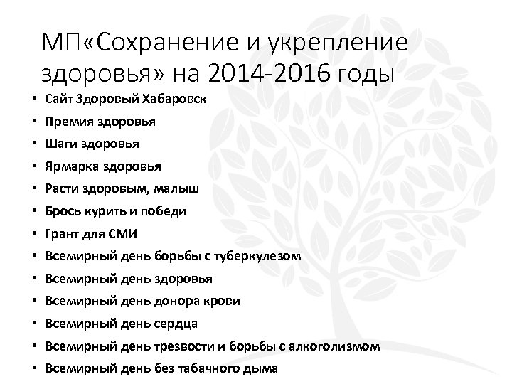 МП «Сохранение и укрепление здоровья» на 2014 -2016 годы • Сайт Здоровый Хабаровск • Премия здоровья • Шаги здоровья • Ярмарка здоровья • Расти здоровым, малыш • Брось курить и победи • Грант для СМИ • Всемирный день борьбы с туберкулезом • Всемирный день здоровья • Всемирный день донора крови • Всемирный день сердца • Всемирный день трезвости и борьбы с алкоголизмом • Всемирный день без табачного дыма