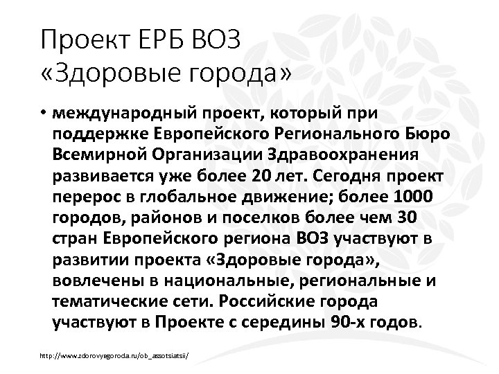 Проект ЕРБ ВОЗ «Здоровые города» • международный проект, который при поддержке Европейского Регионального Бюро Всемирной Организации Здравоохранения развивается уже более 20 лет. Сегодня проект перерос в глобальное движение; более 1000 городов, районов и поселков более чем 30 стран Европейского региона ВОЗ участвуют в развитии проекта «Здоровые города» , вовлечены в национальные, региональные и тематические сети. Российские города участвуют в Проекте с середины 90 -х годов. http: //www. zdorovyegoroda. ru/ob_assotsiatsii/