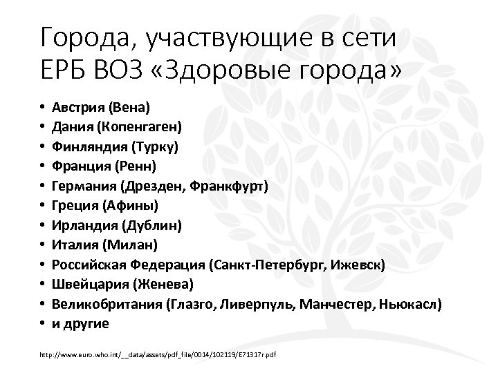 Города, участвующие в сети ЕРБ ВОЗ «Здоровые города» • • • Австрия (Вена) Дания (Копенгаген) Финляндия (Турку) Франция (Ренн) Германия (Дрезден, Франкфурт) Греция (Афины) Ирландия (Дублин) Италия (Милан) Российская Федерация (Санкт-Петербург, Ижевск) Швейцария (Женева) Великобритания (Глазго, Ливерпуль, Манчестер, Ньюкасл) и другие http: //www. euro. who. int/__data/assets/pdf_file/0014/102119/E 71317 r. pdf