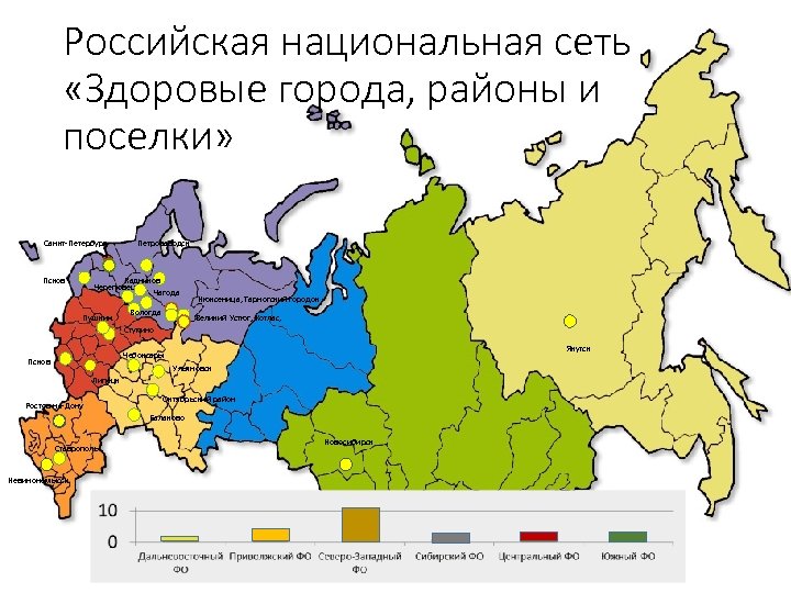 Российская национальная сеть «Здоровые города, районы и поселки» Санкт-Петербург Псков Петрозаводск Кадников Череповец Чагода Пушкин Вологда Нюксеница, Тарногский городок Великий Устюг, Котлас, Ступино Якутск Чебоксары Псков Ульяновск Липецк Ростов-на-Дону Октябрьский район Балаково Ставрополь Невинономысск Новосибирск
