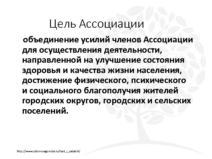 Цель Ассоциации объединение усилий членов Ассоциации для осуществления деятельности, направленной на улучшение состояния здоровья и качества жизни населения, достижение физического, психического и социального благополучия жителей городских округов, городских и сельских поселений. http: //www. zdorovyegoroda. ru/tseli_i_zadachi/