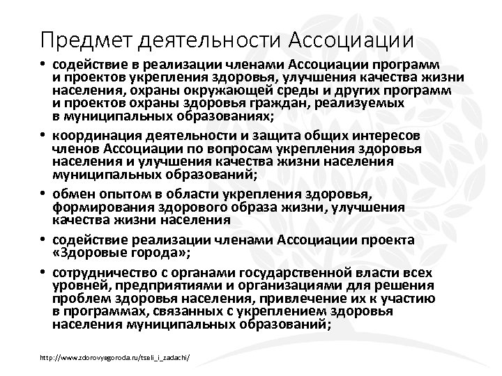 Предмет деятельности Ассоциации • содействие в реализации членами Ассоциации программ и проектов укрепления здоровья, улучшения качества жизни населения, охраны окружающей среды и других программ и проектов охраны здоровья граждан, реализуемых в муниципальных образованиях; • координация деятельности и защита общих интересов членов Ассоциации по вопросам укрепления здоровья населения и улучшения качества жизни населения муниципальных образований; • обмен опытом в области укрепления здоровья, формирования здорового образа жизни, улучшения качества жизни населения • содействие реализации членами Ассоциации проекта «Здоровые города» ; • сотрудничество с органами государственной власти всех уровней, предприятиями и организациями для решения проблем здоровья населения, привлечение их к участию в программах, связанных с укреплением здоровья населения муниципальных образований; http: //www. zdorovyegoroda. ru/tseli_i_zadachi/