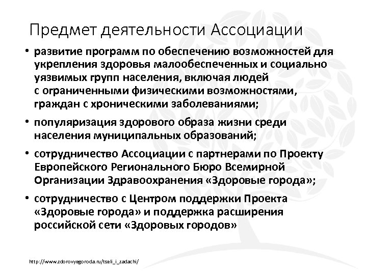 Предмет деятельности Ассоциации • развитие программ по обеспечению возможностей для укрепления здоровья малообеспеченных и социально уязвимых групп населения, включая людей с ограниченными физическими возможностями, граждан с хроническими заболеваниями; • популяризация здорового образа жизни среди населения муниципальных образований; • сотрудничество Ассоциации с партнерами по Проекту Европейского Регионального Бюро Всемирной Организации Здравоохранения «Здоровые города» ; • сотрудничество с Центром поддержки Проекта «Здоровые города» и поддержка расширения российской сети «Здоровых городов» http: //www. zdorovyegoroda. ru/tseli_i_zadachi/