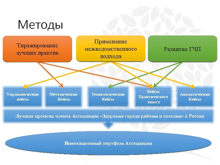 Методы Применение межведомственного подхода Тиражирование лучших практик Управленческие кейсы Методические Кейсы Технологические Кейсы Развитие ГЧП Кейсы Практического опыта Аналитические Кейсы Лучшие проекты членов Ассоциации «Здоровые города районы и поселки» в России Инновационный портфель Ассоциации