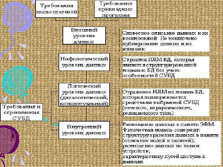 От параметров физической модели зависят такие характеристики функционирования БД: объем памяти и время реакции системы. Физические параметры БД можно изменять в процессе ее эксплуатации с целью повышения эффективности функционирование системы. Изменение физических параметров не предопределяет необходимости изменения инфологической и даталогической моделей. Схема взаимосвязи уровней представления данных в БД изображена на след. рисунке. В соответствии с этими уровнями проектируется БД.