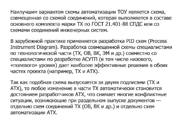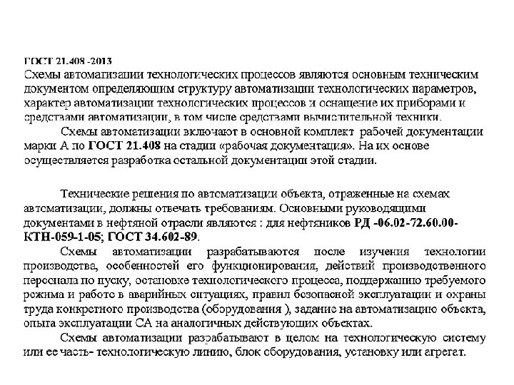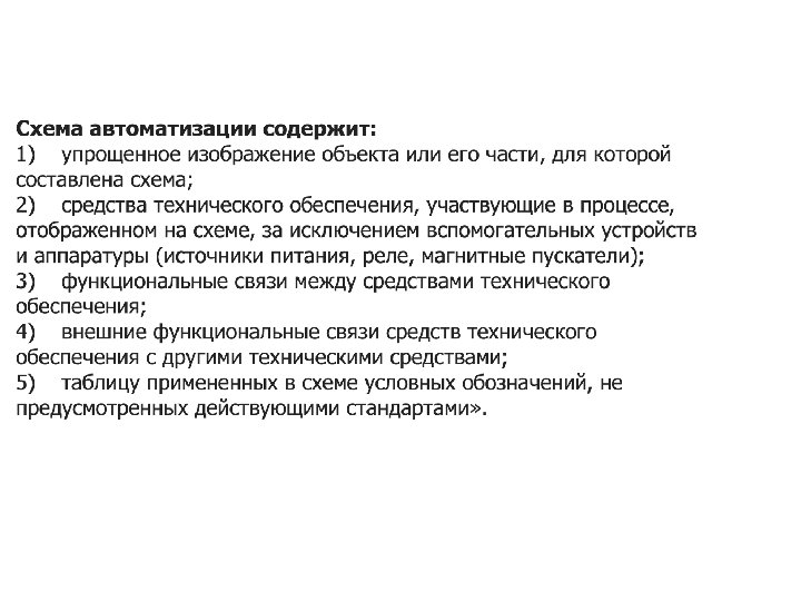 Схемы автоматизации устанавливают: • оптимальный объем автоматизации; • технологические параметры, подлежащие автоматическому регулированию, контролю, сигнализации и блокировкам; • основные технические средства автоматизации; • размещение средств автоматизации - местных приборов, отборных устройств, аппаратуры на местных, центральных щитах, диспетчерских пунктах и т. д. и определение способов передачи информации; • взаимосвязь между средствами автоматизации