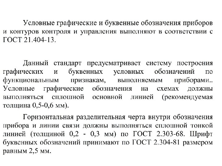 Условные графические обозначения на схемах выполняют сплошной толстой линией, а горизонтальную разделительную черту внутри графического обозначения и линии связи - тонкой сплошной линией по ГОСТ 2. 303 -68 Шрифт буквенных обозначений принимают по ГОСТ 2. 304 -81 2, 5 мм Условные обозначения приборов и средств автоматизации применяемые в схемах, включают графические, буквенные и цифровые обозначения. В верхней части графического обозначения наносят буквенное обозначение измеряемой величины и функционального признака прибора, определяющего назначение. В нижней части графического обозначения наносят цифровое (позиционное) обозначение прибора или комплекта средств автоматизации Порядок расположения букв в буквенном обозначении принимают следующим: – основное обозначение измеряемой величины – дополнительное обозначение измеряемой величины – обозначение функционального признака прибора