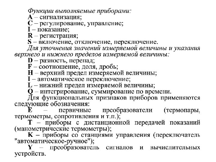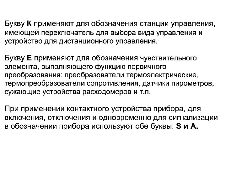 Буквенные обозначения устройств, выполненных в виде отдельных блоков и предназначенных для ручных операций, независимо от того, в состав какого комплекта они входят, должны начинаться с буквы Н. Порядок расположения буквенных обозначений функциональных признаков прибора, принимается с соблюдением следующей последовательности обозначений: I, R, C, S, A При построении буквенных обозначений указывают не все функциональные признаки прибора, а лишь те, которые используют в данной схеме. Букву А используют для обозначения функций «сигнализации» независимо от того, вынесена ли сигнальная аппаратура на какой-либо щит или для сигнализации используются лампы, встроенные в сам прибор. Букву S применяют для обозначения контактного устройства прибора, используемого только для включения, отключения, переключения, блокировки. При применении контактного устройства прибора, для включения, отключения и одновременно длясигнализации в обозначении прибора используют обе буквы: S и А .
