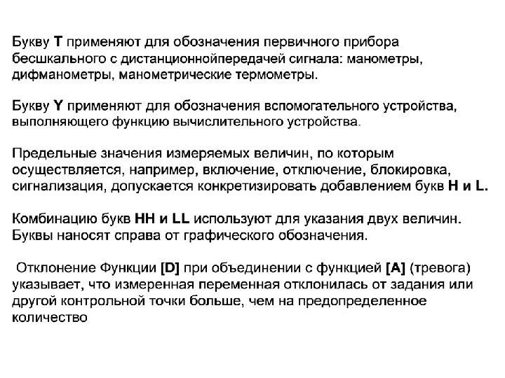 Принцип построения условного обозначения прибора Основное обозначение измеряемой величины Дополнительное обозначение измеряемой величины Обозначение функционального признака прибора PDIRC Р (Давление) D (Перепад давления) I (Показание) R (Регистрация) С (Автоматическое регулирование) Последовательность буквенного обозначения Место для нанесения позиционного обозначения