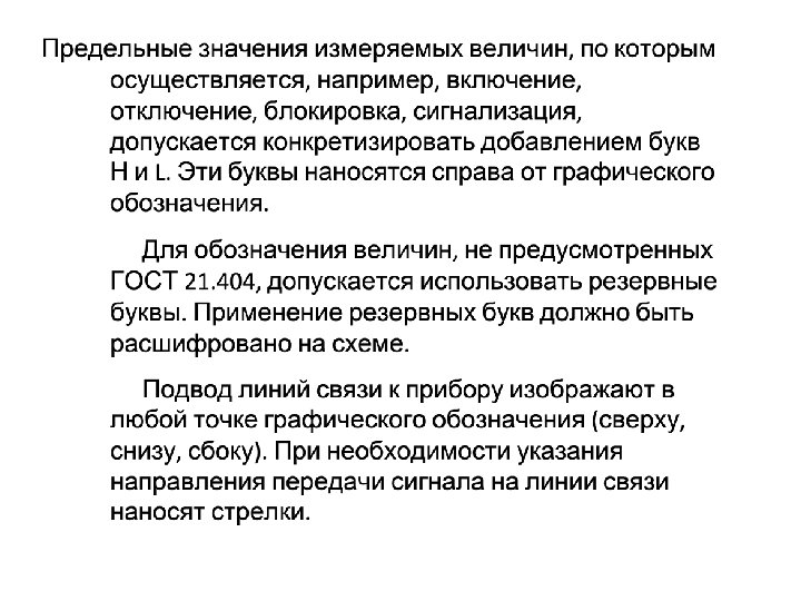 ГОСТ 21. 404 «Обозначения условные приборов и средств автоматизации в схемах» Наименование Обозначение 1. Прибор, устанавливаемый вне щита (по месту): а) основное обозначение б) допустимое обозначение 2. Прибор, устанавливаемый на щите, пульте: а) основное обозначение б) допустимое обозначение 3. Исполнительный механизм 4. Исполнительный механизм с дополнительным ручным приводом 5. Линии связи. Общее назначение 6. Пресечение линий связи без соединения друг с другом 7. Пересечение линий связи с соединением между собой н