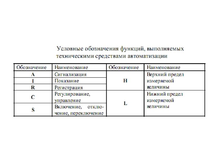 Упрощенный способ выполнения схем автоматизации В нижней части схемы рекомендуется приводить таблицу контуров в соответствии с приложением В. (ГОСТ 21. 408) В таблице контуров указывают номера контуров и номер листа основного комплекта, на котором приведен состав каждого контура. Контур (независимо от количества входящих в него элементов) изображают в виде окружности (овала), разделенного горизонтальной чертой. В верхнюю часть окружности записывают буквенное обозначение, определяющее измеряемый (регулируемой) параметр и функции, выполняемые данным контуром, в нижнюю номер контура. Для контуров систем автоматического регулирования, кроме того, на схеме изображают исполнительные механизмы, регулирующие органы и линии связи, соединяющую контуры с исполнительными механизмами. Предельные рабочие значения измеряемых (регулируемых) величин указывают рядом с графическими обозначениями контуров или в дополнительной графе таблицы контуров. Состав каждого контура должен быть приведен на: • -принципиальной (электрической, пневматической) схеме контроля, регулирования и управления; • -схеме соединений внешних проводок.