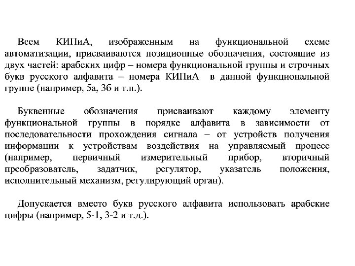В верхней части графического обозначения наносят буквенные обозначения измеряемой величины и функционального признака прибора, определяющего назначение. В нижней части графического обозначения наносят цифровое (позиционное) обозначение прибора или комплекта средств автоматизации