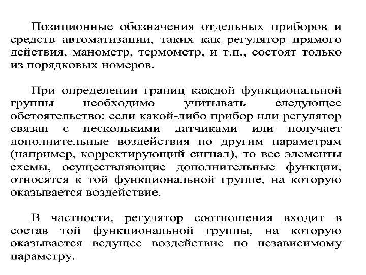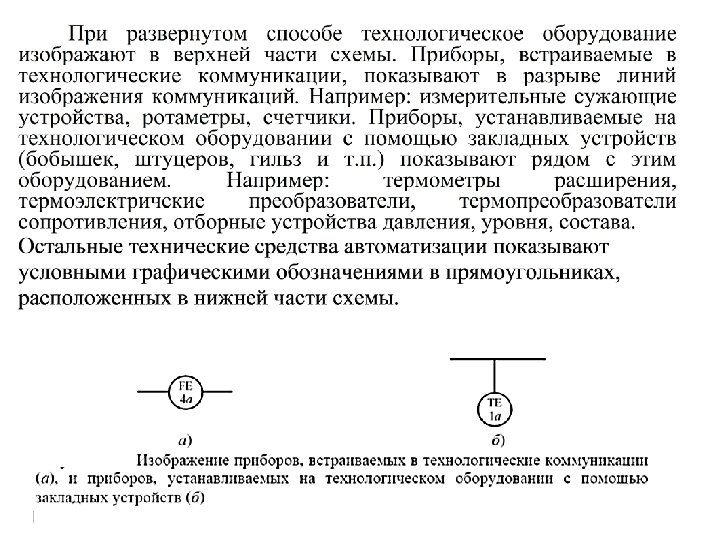 Развернутый способ выполнения схем автоматизации Приборы, встраиваемые в технологические коммуникации, показывают в разрыве линий изображения коммуникаций, устанавливаемые на технологи-ческом оборудовании (с помощью закладных конструкций) показывают рядом Остальные технические средства автоматизации, показывают условными графическими обозначениями в прямоугольниках, расположенных в нижней части схемы. Каждому прямоугольнику присваивают заголовки, соответствующие показанным в них техническим средствам. Первым располагают прямоугольник в котором показаны вне щитовые приборы, конструктивно не связанные с технологическим оборудованием, с заголовком «Приборы по месту» , ниже- прямоугольники, в которых показаны щиты, а также SCADA -комплекс технических средств. На схеме автоматизации буквенно-цифровые обозначения приборов указывают в нижней части окружности (овала) или с правой стороны от него. Одна функциональная схема может использоваться для ряда однотипных агрегатов, при этом в примечании должно содержаться пояснение: для какого агрегата схема составлена и для какого (каких) аналогична. В проектах принято объединять ряд одинаковых замеров в одно условное обозначение (с указанием количества приборов), а так же объединять (изображать одной линией) соединительные линии идущие к одному прибору.