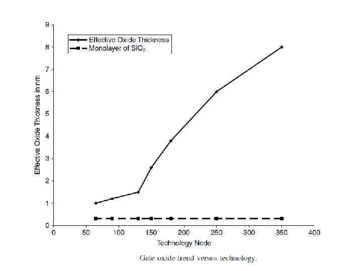 50 Масштабирование подзатворного диэлектрика По прогнозу SIA масштабирование толщины Si. O 2 должно было закончиться в 2002 -2005 гг до предельной величины ~2 нм, после чего, начиная с технологии 0, 13 -микронной технологии предполагалось использовать подзатворные диэлектрики на основе новых материалов. Однако, этот прогноз не сбылся. Доказательством этого является технологии 90 нм и 65 нм от Intel, где используется Si. O 2 толщиной 1, 2 нм. Так как вследствие кванто-механического эффекта и обеднения поликремниевого затвора, заряд в канале и в инверсном слое локализирован на некотором расстоянии от границы Si/Si. O и от границы Si/Si*, суммарное увеличение эффективной толщины оксида в МОПТ в режиме инверсии составляет около 0, 7 нм, что дает возможность использовать Si. O 2 при дальнейшем масштабировании МОПТ, вплоть до технологии 45 нм. Прогноз масштабирования толщины подзатворного Si. O 2 Кванто-механический эффект