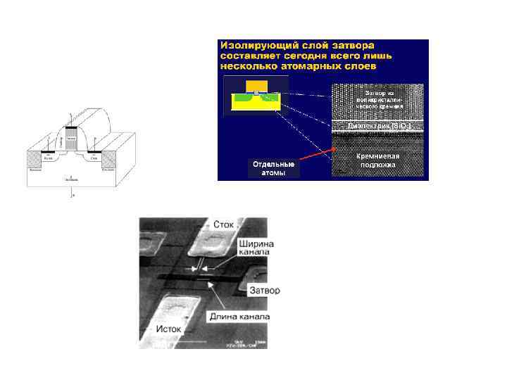 Затвор из проводящего поликремния отделен от канала транзистора тончайшим (толщиной всего 1, 2 нм или 5 атомов!) слоем диоксида кремния (материала, десятилетиями используемого в качестве подзатворного диэлектрика).