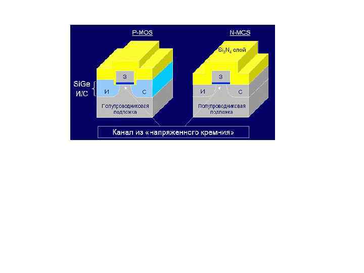 49 Методы улучшения характеристик МОПТ IV. Использование «напряженного кремния» Суть технологии лежит в изменении расстояния между атомами кремния. Для этого используют материал, у которого расстояние между атомами больше/меньше, чем у кремния, и “соединяют” кристаллические решетки. При сведении этих материалов на расстояния, не превышающих межатомные, между ними возникает взаимодействие. Эти межатомные силы вызывают искажение строения кристаллической решетки, расстояние между атомами на приконтактном участке изменяется, что облегчает протекание тока. В n. MOПТ поверх транзистора в направлении движения электрического тока наносится слой нитрида кремния (Si 3 N 4), в результате чего кремниевая кристаллическая решетка и "растягивается". В p. МОПТ "растяжение" достигается за счет нанесения слоя Si. Ge в зоне образования носителей тока - здесь решетка "сжимается" в направлении движения электрического тока, и потому "дырочный" ток течет свободнее. В обоих случаях прохождение тока значительно облегчается: в первом случае - на 10%, во втором - на 25%. Сочетание же обеих технологий дает 20 -30 -процентное увеличение быстродействия КМОП ИС.