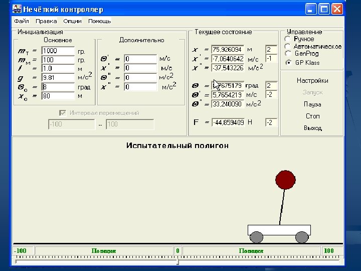 База правил 1. IF (позиция отрицательная) и (угловая скорость отрицательная большая) THEN сила положительная малая; 2. ELSE IF (позиция отрицательная) и (угловая скорость отрицательная малая) THEN сила положительная большая; 3. ELSE IF (позиция неотрицательная) и (угловая скорость отрицательная) THEN сила отрицательная большая; 4. ELSE IF (угол отрицательный) и (угловая скорость неотрицательная) THEN сила нулевая 5. ELSE IF (скорость отрицательная) и (угол положительный) и (угловая скорость нулевая) THEN сила нулевая; 6. ELSE IF (скорость отрицательная) и угол (положительный) и (угловая скорость положительна) THEN сила положительная большая; 7. ELSE IF (позиция отрицательная) и (скорость неотрицательная) и (угол неотрицательный) и (угловая скорость неотрицательная) THEN сила положительная большая; 8. ELSE IF (позиция положительная) и (скорость неотрицательная) и (угол неотрицательный) и (угловая скорость неотрицательная) THEN сила положительная большая;
