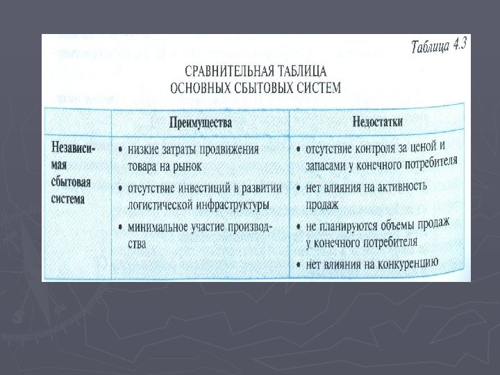 При выборе собственной сбытовой системы: ► 4. Сегментирование рынков сбыта по регионам обслуживания собственной сетью с учетом политики обслуживания клиентов, установленной компанией. ► 4. 1. Определение регионов товароснабжения. ► 4. 2. Определение уровня товарных запасов у клиентов и частоты доставки. ► 5. Определение оптимальной структуры системы распределения. ► 5. 1. Локализация сети. ► 5. 2. Разработка общей системы товароснабжения. Распределение товарных запасов в системе товароснабжения складской сети.