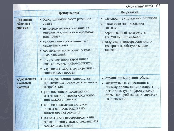 ► • Выбор между «сделать самому» или «отдать посреднику» должен стать обязательным не только при осуществлении функций, но и операций. ► • В цепи не должно быть участников с одинаковыми функциями. ► • Конечный потребитель работает на текущих запасах, поэтому поставки конечным клиентам должны быть мелкими и частыми при максимальном обеспечении широты ассортимента. ► • Информация, поступающая от потребителя в режиме реального времени, гарантирует точность управления запасами и является залогом сокращения собственных страховых запасов.