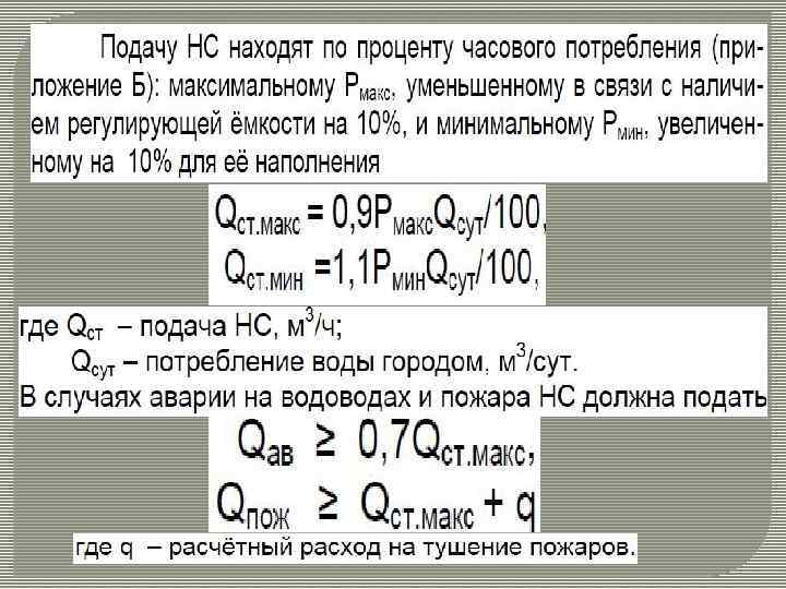 Q 1 = К 1 Qcyт. max/100 (10) q 1 = Q 1 1000/3600 (11) или , л /с : - для 2 -го – при подаче воды насосами в сеть во время пожара в часы I ступени , м 3 / ч : Q 2= Q 1 + Σq пож* 3600 / 1000 (12) q 2 = Q 2 1000/3600 (13) или , л /с : - для 3 -го – при подаче воды насосами в водонапорную башню (контррезервуар) в часы 1 -ой ступени при аварии на водоводе , м 3 / ч :