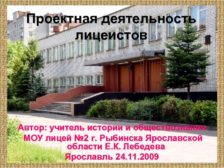 Проектная деятельность лицеистов Автор: учитель истории и обществознания МОУ лицей № 2 г. Рыбинска Ярославской области Е. К. Лебедева Ярославль 24. 11. 2009