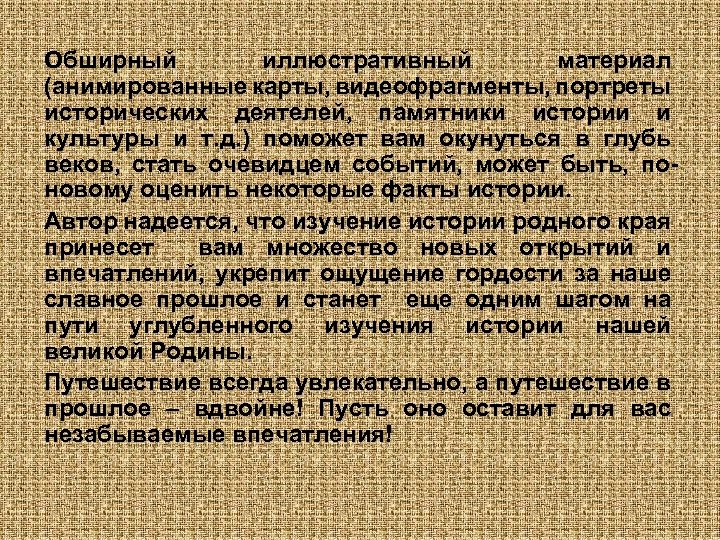 Обширный иллюстративный материал (анимированные карты, видеофрагменты, портреты исторических деятелей, памятники истории и культуры и т. д. ) поможет вам окунуться в глубь веков, стать очевидцем событий, может быть, поновому оценить некоторые факты истории. Автор надеется, что изучение истории родного края принесет вам множество новых открытий и впечатлений, укрепит ощущение гордости за наше славное прошлое и станет еще одним шагом на пути углубленного изучения истории нашей великой Родины. Путешествие всегда увлекательно, а путешествие в прошлое – вдвойне! Пусть оно оставит для вас незабываемые впечатления!