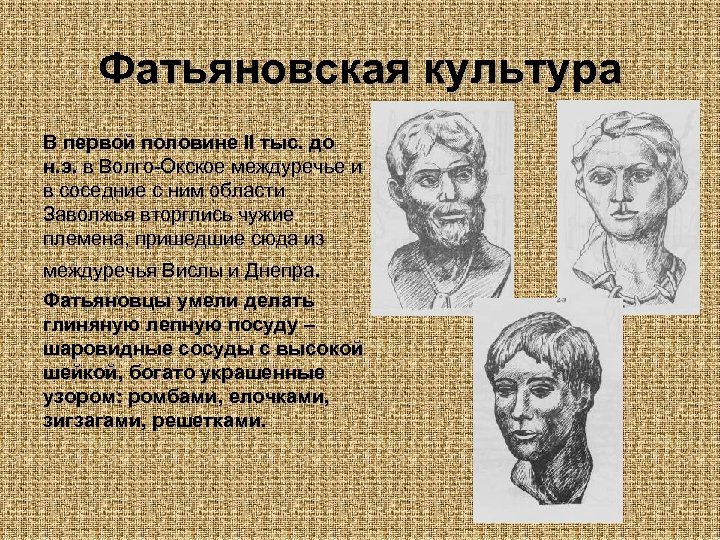 Фатьяновская культура В первой половине II тыс. до н. э. в Волго-Окское междуречье и в соседние с ним области Заволжья вторглись чужие племена, пришедшие сюда из междуречья Вислы и Днепра. Фатьяновцы умели делать глиняную лепную посуду – шаровидные сосуды с высокой шейкой, богато украшенные узором: ромбами, елочками, зигзагами, решетками.