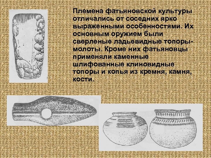 Племена фатьяновской культуры отличались от соседних ярко выраженными особенностями. Их основным оружием были сверленые ладьевидные топорымолоты. Кроме них фатьяновцы применяли каменные шлифованные клиновидные топоры и копья из кремня, камня, кости.