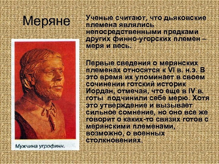 Меряне Ученые считают, что дьяковские племена являлись непосредственными предками других финно-угорских племен – меря и весь. Первые сведения о мерянских племенах относятся к VI в. н. э. В это время их упоминает в своем сочинении готский историк Иордан, отмечая, что еще в IV в. готы подчинили себе мерю. Хотя это утверждение и вызывает сильное сомнение, но оно все же говорит о каких-то связях готов с мерянскими племенами, возможно, о военных столкновениях.