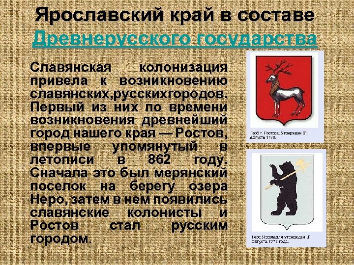 Ярославский край в составе Древнерусского государства Славянская колонизация привела к возникновению славянских, усских ородов. русских городов. р г Первый из них по времени возникновения древнейший город нашего края — Ростов, впервые упомянутый в летописи в 862 году. Сначала это был мерянский поселок на берегу озера Неро, затем в нем появились славянские колонисты и Ростов стал русским городом.