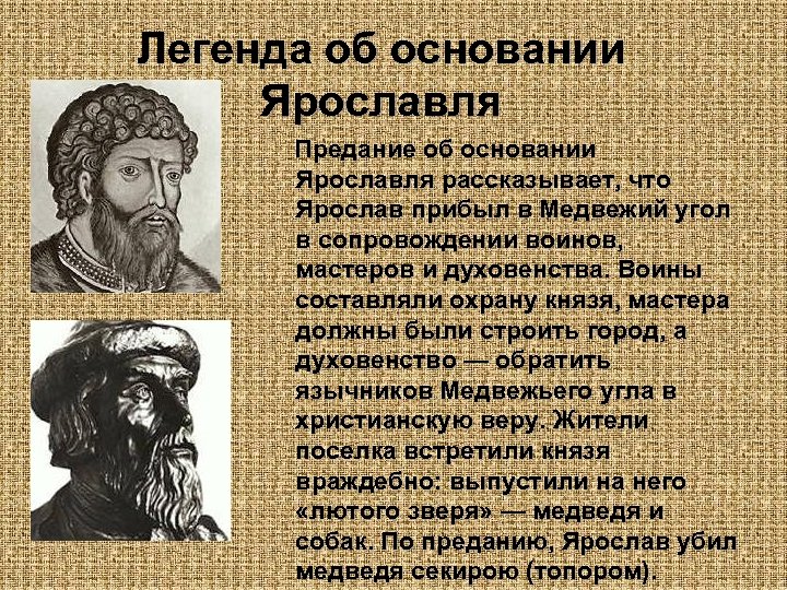 Легенда об основании Ярославля Предание об основании Ярославля рассказывает, что Ярослав прибыл в Медвежий угол в сопровождении воинов, мастеров и духовенства. Воины составляли охрану князя, мастера должны были строить город, а духовенство — обратить язычников Медвежьего угла в христианскую веру. Жители поселка встретили князя враждебно: выпустили на него «лютого зверя» — медведя и собак. По преданию, Ярослав убил медведя секирою (топором).