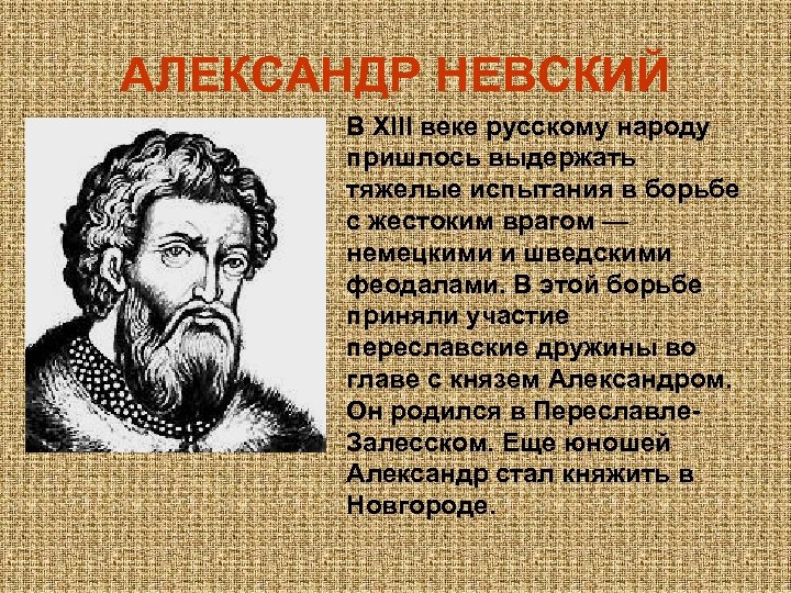 АЛЕКСАНДР НЕВСКИЙ • В XIII веке русскому народу пришлось выдержать тяжелые испытания в борьбе с жестоким врагом — немецкими и шведскими феодалами. В этой борьбе приняли участие переславские дружины во главе с князем Александром. Он родился в Переславле. Залесском. Еще юношей Александр стал княжить в Новгороде.