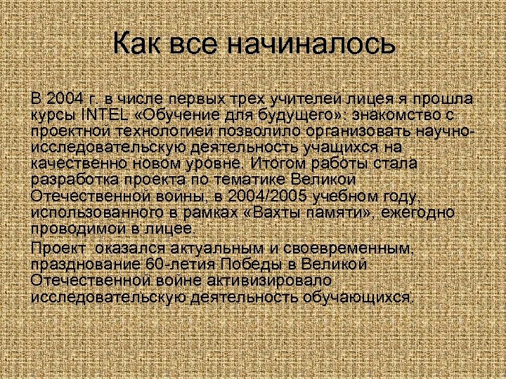 Как все начиналось В 2004 г. в числе первых трех учителей лицея я прошла курсы INTEL «Обучение для будущего» : знакомство с проектной технологией позволило организовать научноисследовательскую деятельность учащихся на качественно новом уровне. Итогом работы стала разработка проекта по тематике Великой Отечественной войны, в 2004/2005 учебном году, использованного в рамках «Вахты памяти» , ежегодно проводимой в лицее. Проект оказался актуальным и своевременным, празднование 60 -летия Победы в Великой Отечественной войне активизировало исследовательскую деятельность обучающихся.