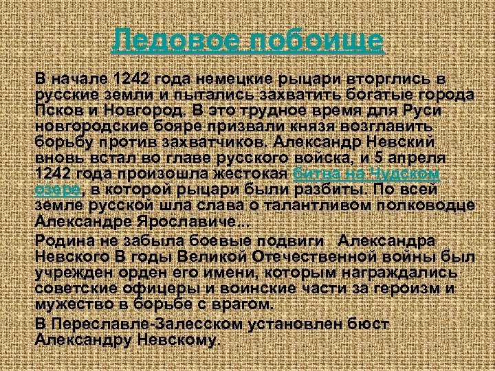 Ледовое побоище В начале 1242 года немецкие рыцари вторглись в русские земли и пытались захватить богатые города Псков и Новгород. В это трудное время для Руси новгородские бояре призвали князя возглавить борьбу против захватчиков. Александр Невский вновь встал во главе русского войска, и 5 апреля 1242 года произошла жестокая битва на Чудском озере, в которой рыцари были разбиты. По всей земле русской шла слава о талантливом полководце Александре Ярославиче. . . Родина не забыла боевые подвиги Александра Невского В годы Великой Отечественной войны был учрежден орден его имени, которым награждались советские офицеры и воинские части за героизм и мужество в борьбе с врагом. В Переславле-Залесском установлен бюст Александру Невскому.