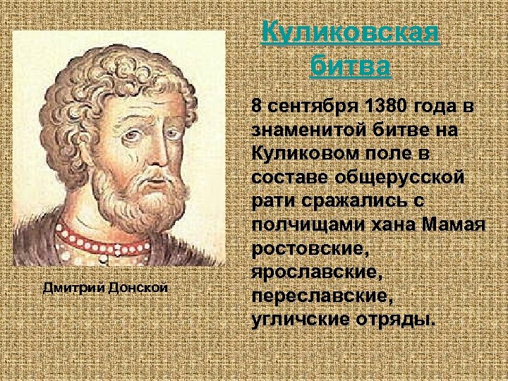 Куликовская битва Дмитрий Донской 8 сентября 1380 года в знаменитой битве на Куликовом поле в составе общерусской рати сражались с полчищами хана Мамая ростовские, ярославские, переславские, угличские отряды.