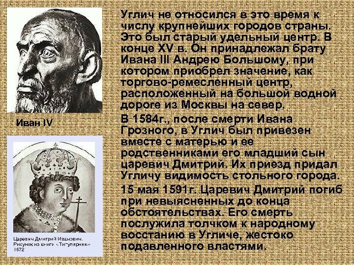 Иван IV Углич не относился в это время к числу крупнейших городов страны. Это был старый удельный центр. В конце XV в. Он принадлежал брату Ивана III Андрею Большому, при котором приобрел значение, как торгово-ремесленный центр, расположенный на большой водной дороге из Москвы на север. В 1584 г. , после смерти Ивана Грозного, в Углич был привезен вместе с матерью и ее родственниками его младший сын царевич Дмитрий. Их приезд придал Угличу видимость стольного города. 15 мая 1591 г. Царевич Дмитрий погиб при невыясненных до конца обстоятельствах. Его смерть послужила толчком к народному восстанию в Угличе, жестоко подавленного властями.