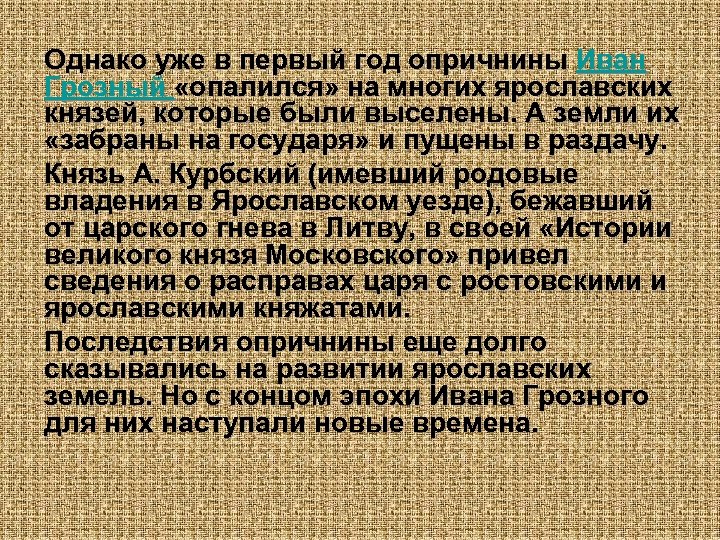 Однако уже в первый год опричнины Иван Грозный «опалился» на многих ярославских князей, которые были выселены. А земли их «забраны на государя» и пущены в раздачу. Князь А. Курбский (имевший родовые владения в Ярославском уезде), бежавший от царского гнева в Литву, в своей «Истории великого князя Московского» привел сведения о расправах царя с ростовскими и ярославскими княжатами. Последствия опричнины еще долго сказывались на развитии ярославских земель. Но с концом эпохи Ивана Грозного для них наступали новые времена.