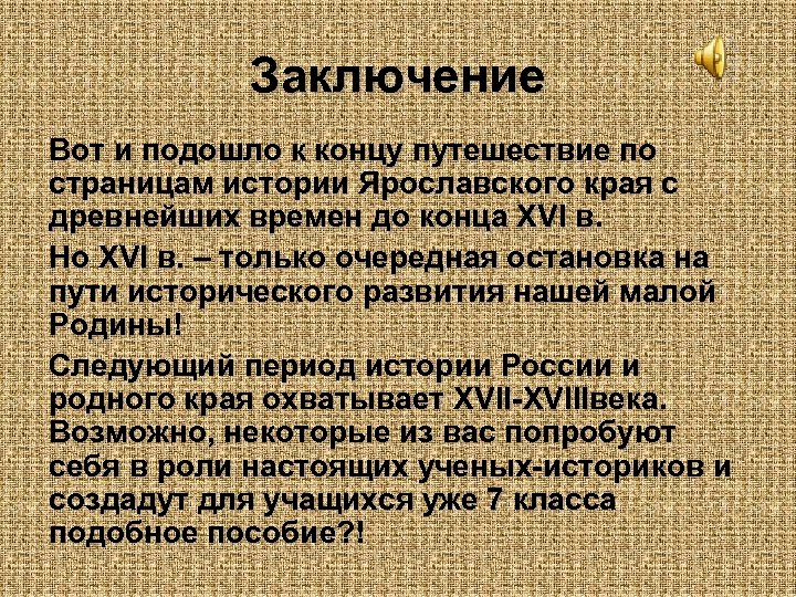 Заключение Вот и подошло к концу путешествие по страницам истории Ярославского края с древнейших времен до конца XVI в. Но XVI в. – только очередная остановка на пути исторического развития нашей малой Родины! Следующий период истории России и родного края охватывает XVII-XVIIIвека. Возможно, некоторые из вас попробуют себя в роли настоящих ученых-историков и создадут для учащихся уже 7 класса подобное пособие? !