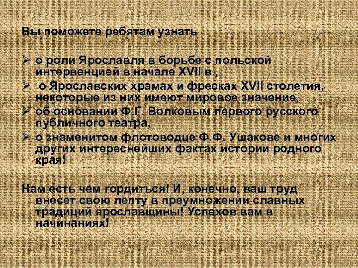 Вы поможете ребятам узнать Ø о роли Ярославля в борьбе с польской интервенцией в начале XVII в. , Ø о Ярославских храмах и фресках XVII столетия, некоторые из них имеют мировое значение, Ø об основании Ф. Г. Волковым первого русского публичного театра, Ø о знаменитом флотоводце Ф. Ф. Ушакове и многих других интереснейших фактах истории родного края! Нам есть чем гордиться! И, конечно, ваш труд внесет свою лепту в преумножении славных традиций ярославщины! Успехов вам в начинаниях!