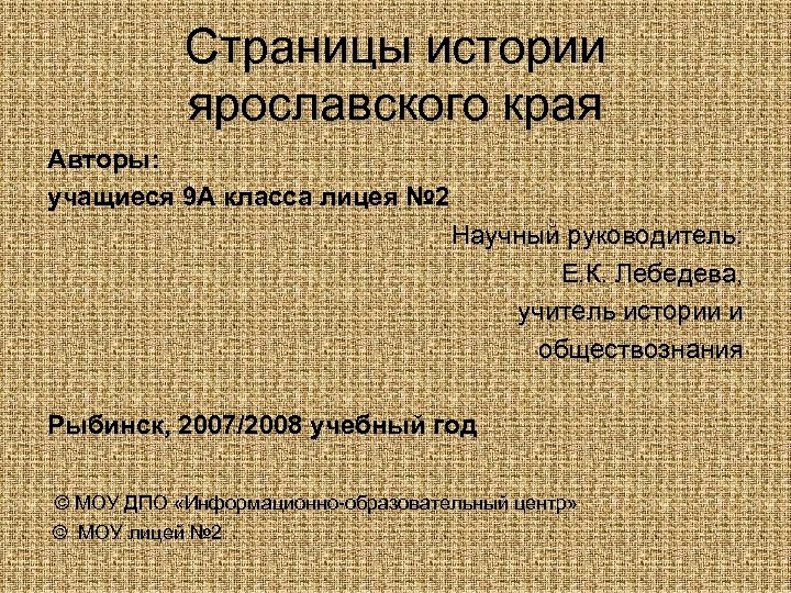 Страницы истории ярославского края Авторы: учащиеся 9 А класса лицея № 2 Научный руководитель: Е. К. Лебедева, учитель истории и обществознания Рыбинск, 2007/2008 учебный год © МОУ ДПО «Информационно-образовательный центр» © МОУ лицей № 2