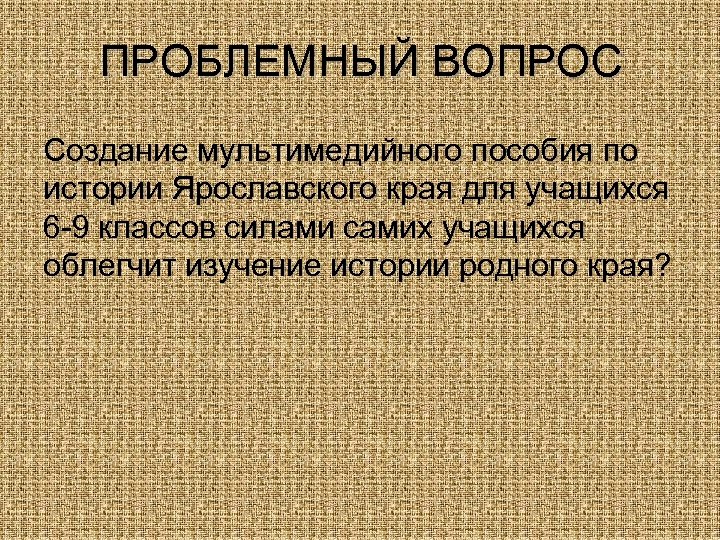 ПРОБЛЕМНЫЙ ВОПРОС Создание мультимедийного пособия по истории Ярославского края для учащихся 6 -9 классов силами самих учащихся облегчит изучение истории родного края?