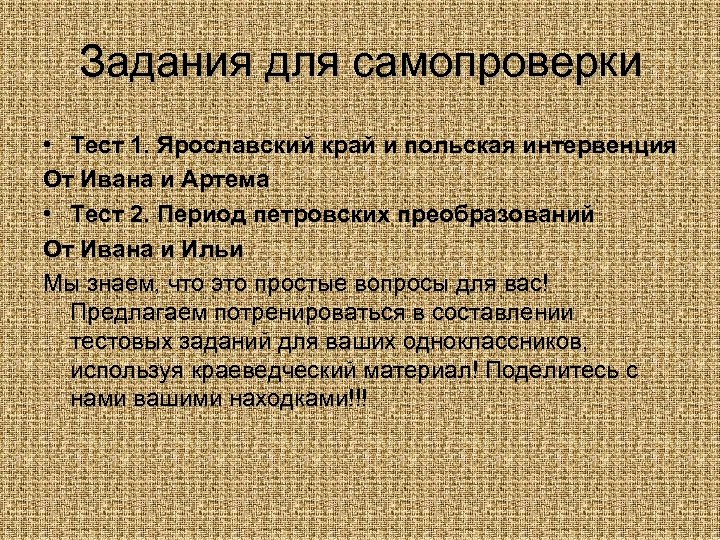 Задания для самопроверки • Тест 1. Ярославский край и польская интервенция От Ивана и Артема • Тест 2. Период петровских преобразований От Ивана и Ильи Мы знаем, что это простые вопросы для вас! Предлагаем потренироваться в составлении тестовых заданий для ваших одноклассников, используя краеведческий материал! Поделитесь с нами вашими находками!!!
