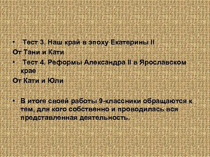 • Тест 3. Наш край в эпоху Екатерины II От Тани и Кати • Тест 4. Реформы Александра II в Ярославском крае От Кати и Юли • В итоге своей работы 9 -классники обращаются к тем, для кого собственно и проводилась вся представленная деятельность.